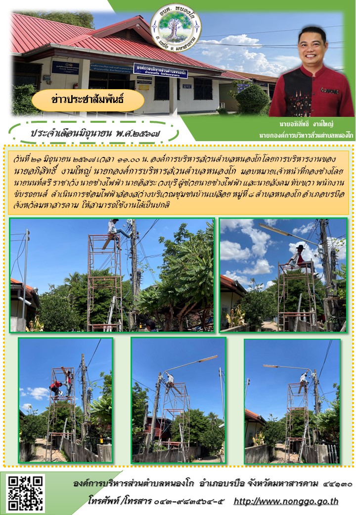 วันที่ 21 มิถุนายน 2567 เวลา 11.00 น. องค์การบริหารส่วนตำบลหนองโก โดยการบริหารงานของ นายอภิสิทธิ์ งามใหญ่ นายกองค์การบริหารส่วนตำบลหนองโก มอบหมายเจ้าหน้าที่กองช่างโดยนายนนท์ตรี ราชาวัง นายช่างไฟฟ้า นายอิสระ วงบุรี ผู้ช่วยนายช่างไฟฟ้า และนายสังคม ทับขวา พนักงานขับรถยนต์ ดำเนินการซ่อมไฟฟ้าส่องสว่างบริเวณชุมชนบ้านเปลือย หมู่ที่ 8 ตำบลหนองโก อำเภอบรบือ จังหวัดมหาสารคาม ให้สามารถใช้งานได้เป็นปกติ
