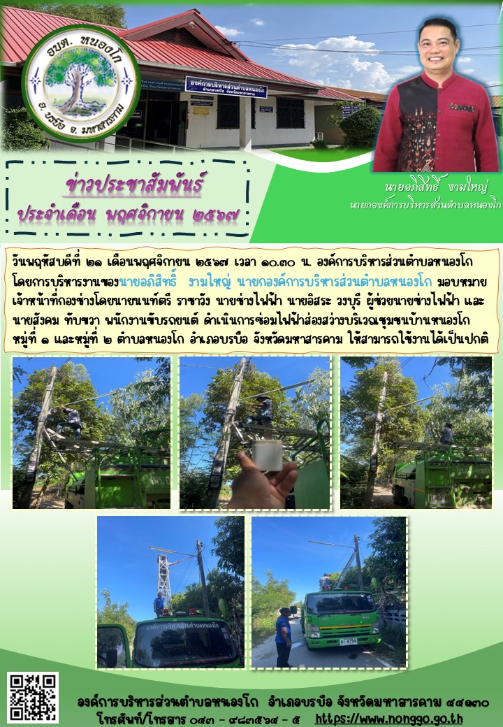 วันพฤหัสบดีที่ 21 เดือนพฤศจิกายน 2567 เวลา 10.30 น. องค์การบริหารส่วนตำบลหนองโก โดยการบริหารงานของนายอภิสิทธิ์ งามใหญ่ นายกองค์การบริหารส่วนตำบลหนองโก มอบหมายเจ้าหน้าที่กองช่างโดยนายนนท์ตรี ราชาวัง นายช่างไฟฟ้า นายอิสระ วงบุรี ผู้ช่วยนายช่างไฟฟ้า และนายสังคม ทับขวา พนักงานขับรถยนต์ ดำเนินการซ่อมไฟฟ้าส่องสว่างบริเวณชุมชนบ้านหนองโก หมู่ที่ 1 และหมู่ที่ 2 ตำบลหนองโก อำเภอบรบือ จังหวัดมหาสารคาม ให้สามารถใช้งานได้เป็นปกติ