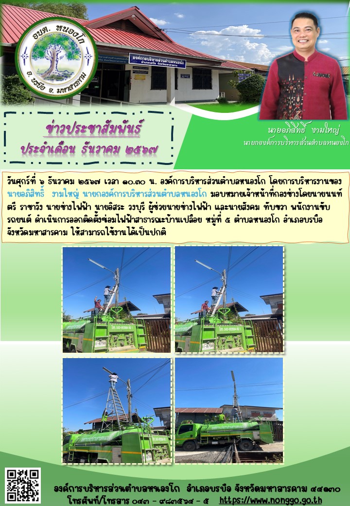 วันศุกร์ที่ 6 ธันวาคม 2567 เวลา 10.30 น. องค์การบริหารส่วนตำบลหนองโก โดยการบริหารงานของนายอภิสิทธิ์ งามใหญ่ นายกองค์การบริหารส่วนตำบลหนองโก มอบหมายเจ้าหน้าที่กองช่างโดยนายนนท์ตรี ราชาวัง นายช่างไฟฟ้า นายอิสระ วงบุรี ผู้ช่วยนายช่างไฟฟ้า และนายสังคม ทับขวา พนักงานขับรถยนต์ ดำเนินการออกติดตั้งซ่อมไฟฟ้าสาธารณะบ้านเปลือย หมู่ที่ 5 ตำบลหนองโก อำเภอบรบือ จังหวัดมหาสารคาม ให้สามารถใช้งานได้เป็นปกติ