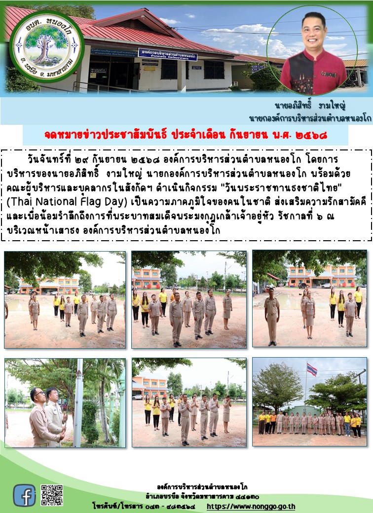 วันจันทร์ที่ 29 กันยายน 2568 องค์การบริหารส่วนตำบลหนองโก โดยการบริหารของนายอภิสิทธิ์ งามใหญ่ นายกองค์การบริหารส่วนตำบลหนองโก พร้อมด้วยคณะผู้บริหารและบุคลากรในสังกัดฯ ดำเนินกิจกรรม “วันพระราชทานธงชาติไทย” (Thai National Flag Day) เป็นความภาคภูมิใจของคนในชาติ ส่งเสริมความรักสามัคคี และเพื่อน้อมรำลึกถึงการที่พระบาทสมเด็จพระมงกุฎเกล้าเจ้าอยู่หัว รัชกาลที่ 6 ณ บริเวณหน้าเสาธง องค์การบริหารส่วนตำบลหนองโก